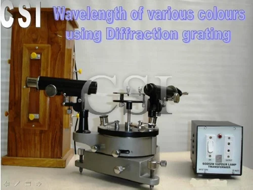 Wavelength of various colours using diffraction grating is a scientific apparatus used to measure the monochromatic source of light. It comprises a quartz crystal attached with tank and advanced spectrometer with a microscopic eye piece.  These products are fabricated with sturdy wooden case and quality raw material including glass and plastics. These instruments are easy to install and high in reliability.