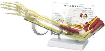 Life size. Shows the shapes and correct origins and insertions of biceps & triceps. Biceps and triceps are made of flexible material, extension and flexion can be shown as well as the antagonist relationship of these two muscles. On base.