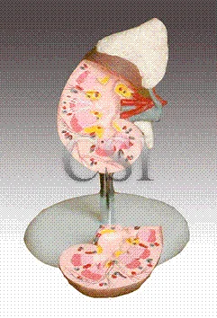 medullary pyramid, papillae etc. Made of PVC plastic, 2 times enlarged. Mounted on