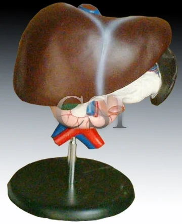 An easy way to study the basic structures of the liver, spleen, blood vessels and pancreas. External structures are illustrated as well as the pancreatic duct of the pancreas. This model also shows the abdominal aorta and inferior vena cava. Life size. Dissectible into 3 parts. Made of PVC plastic. Mounted on stand