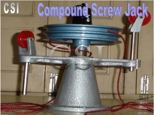 CSI 9078 Compound Screw jack ( Without weights)Consisting of a jack screw of 4 T.P.I. and double start carrying load platform. The nut of the screw is fitted on a pedestal bearing and is keyed to a worm gear of 40 teeth operated by a worm screw. The spindle of the worm screw is provided with an effort wheel of 15 cm diameter. Weights are not included.