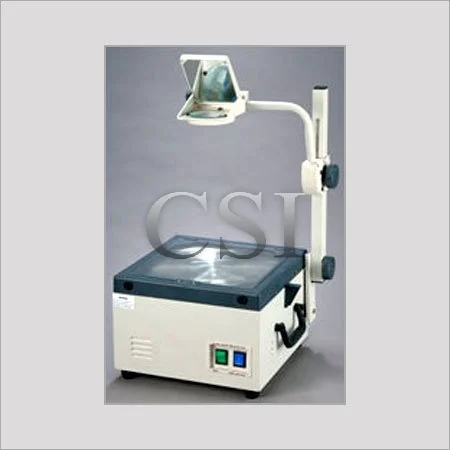 Over Head Projector: ‘CSI’ Very Superior quality. All sheet metal body with synthetic finish, Halogen bulb of 24V-250 watt A.C. shines through high resolution optics to project sharp images uniformly, fresnal condenser lens, 25×25 cm stage aperture, two-way acetate roller attachment, fixed square column with rack and pinion focus by knobs, and thermo control exhaust fan for cooling. Complete with acetate sheet. Double lamp